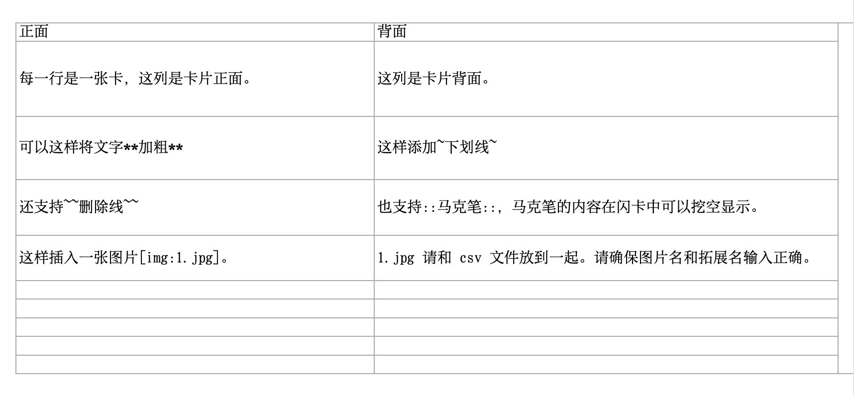 ::马克笔:: 马克笔 ,马克笔也可用作挖空练习(参见【闪卡APP小技巧 - 给文本设定高亮、挖空】)~下划线~ 下划线**加粗** 加粗~~删除线~~ CSV 制卡支持附加图片文件,只需要三步即可。